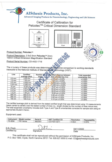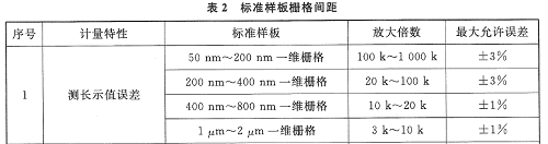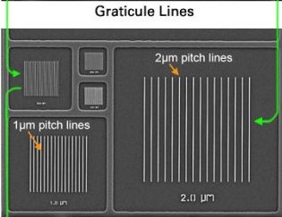 依据《扫描电子显微镜校准规范》(引用GB/T 20307-2006 《纳米级长度的扫描电镜测量方法通则》),扫描电镜校准项目所采用的标准样板为等间距上个标准样板,包含5个以上周期,根据所校准的放大倍数,选取相应的校准样板,如下表所示;故应用此CDMS标样校准放大倍数时,100nm的一维栅格可用于校准放大倍数100k~1000k,250nm的一维栅格可用于校准放大倍数20k~100k,500nm的一维栅格可用于校准放大倍数10k~20k,1µm和2µm的一维栅格可用于校准放大倍数3k~10k。