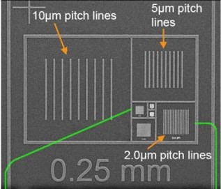 此种Cr和Au/Cr沉积于Si衬底上的栅格图样在二次电子和背散射电子成像时会形成良好的对比,较直接在硅衬底上刻蚀的标样更易呈现具有对比度的像。由于标样衬底为硅材质,Cr和Au/Cr皆有导电性,因此此标样并不易产生荷电效应;且表面结构坚固,可以用等离子清洗机清洁其表面。